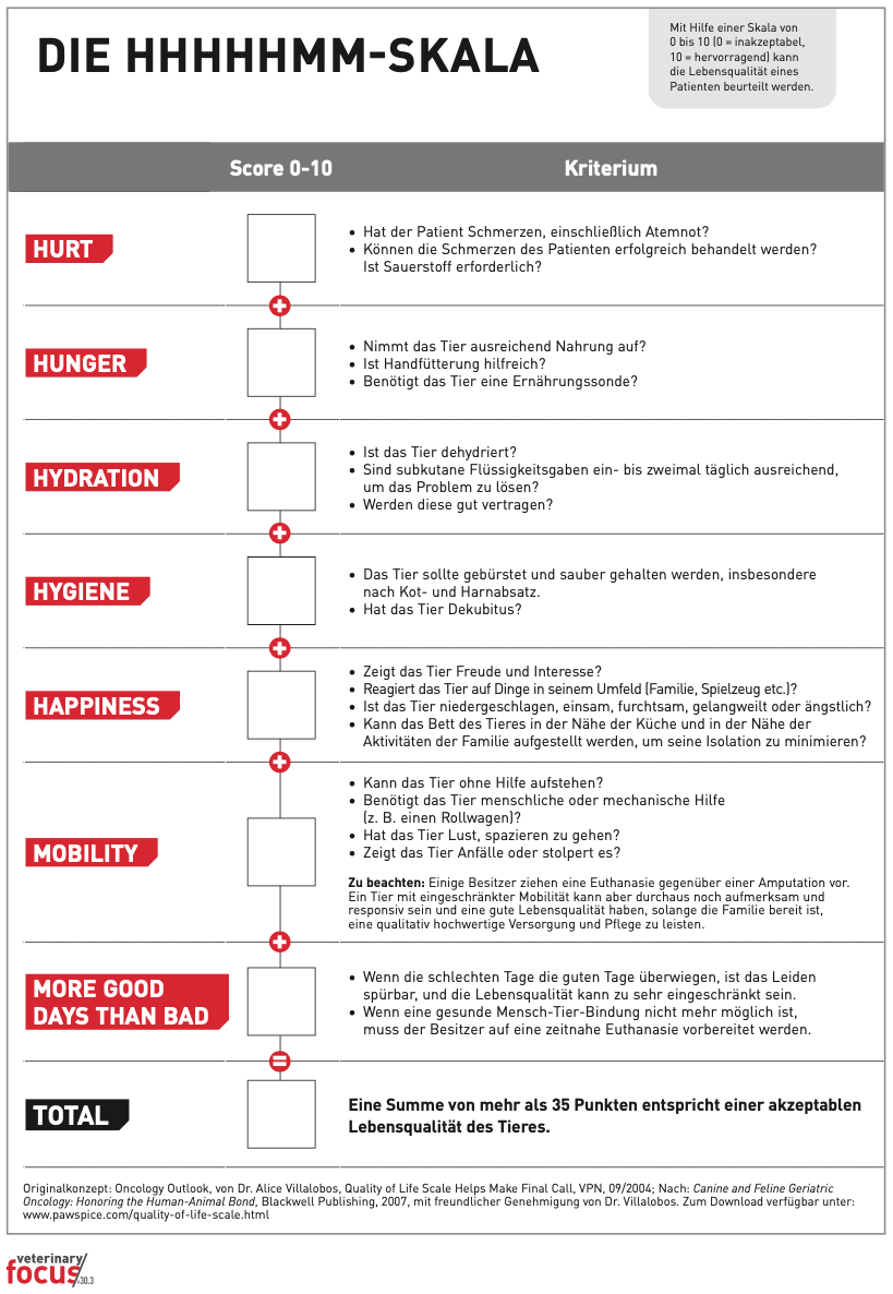 Ebenso wie das Gespräch mit Ihrem Tierarzt, der sachlich und anhand von Parametern wie Blutwerten oder anderen Untersuchungsergebnissen eine Einschätzung zur Lebensqualität und Prognose Ihres Tieres geben kann.